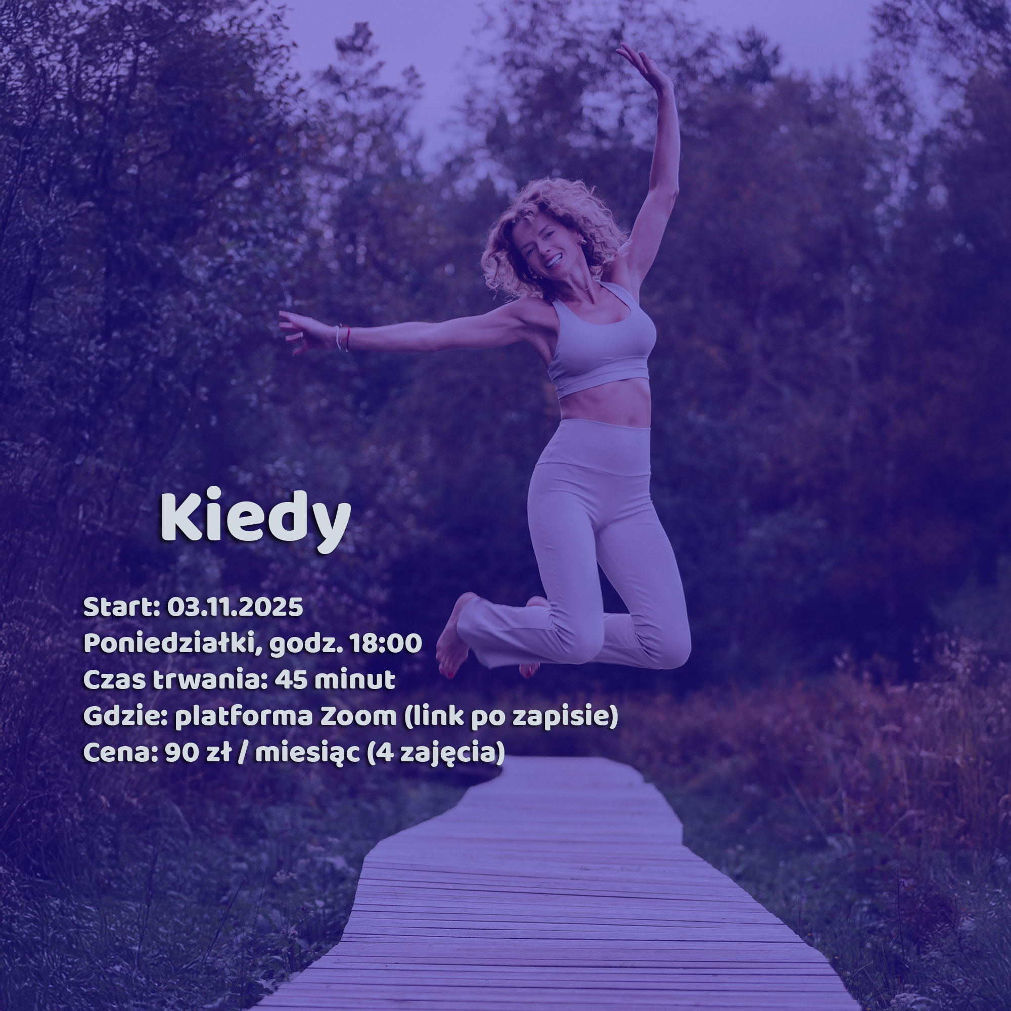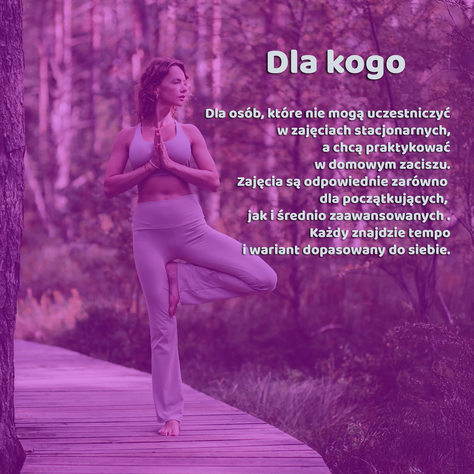 Dla kogo: Dla osób, które nie mogą uczestniczyć w zajęciach stacjonarnych, a chcą praktykować w domowym zaciszu. Zajęcia są odpowiednie zarówno dla początkujących, jak i średnio zaawansowanych — każdy znajdzie tempo i wariant dopasowany do siebie.